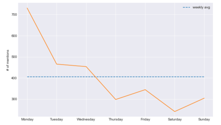 You’ll also see an unusual spike in meatless mentions on Friday and Sunday in week 4 (Figure 2). Turns out, Barack Obama’s birthday party on Saturday included some meatless options, which added some buzz around the topic. As the dataset is so small, any special event or celebrity mentions will throw the expected pattern off, but we can trust the average.